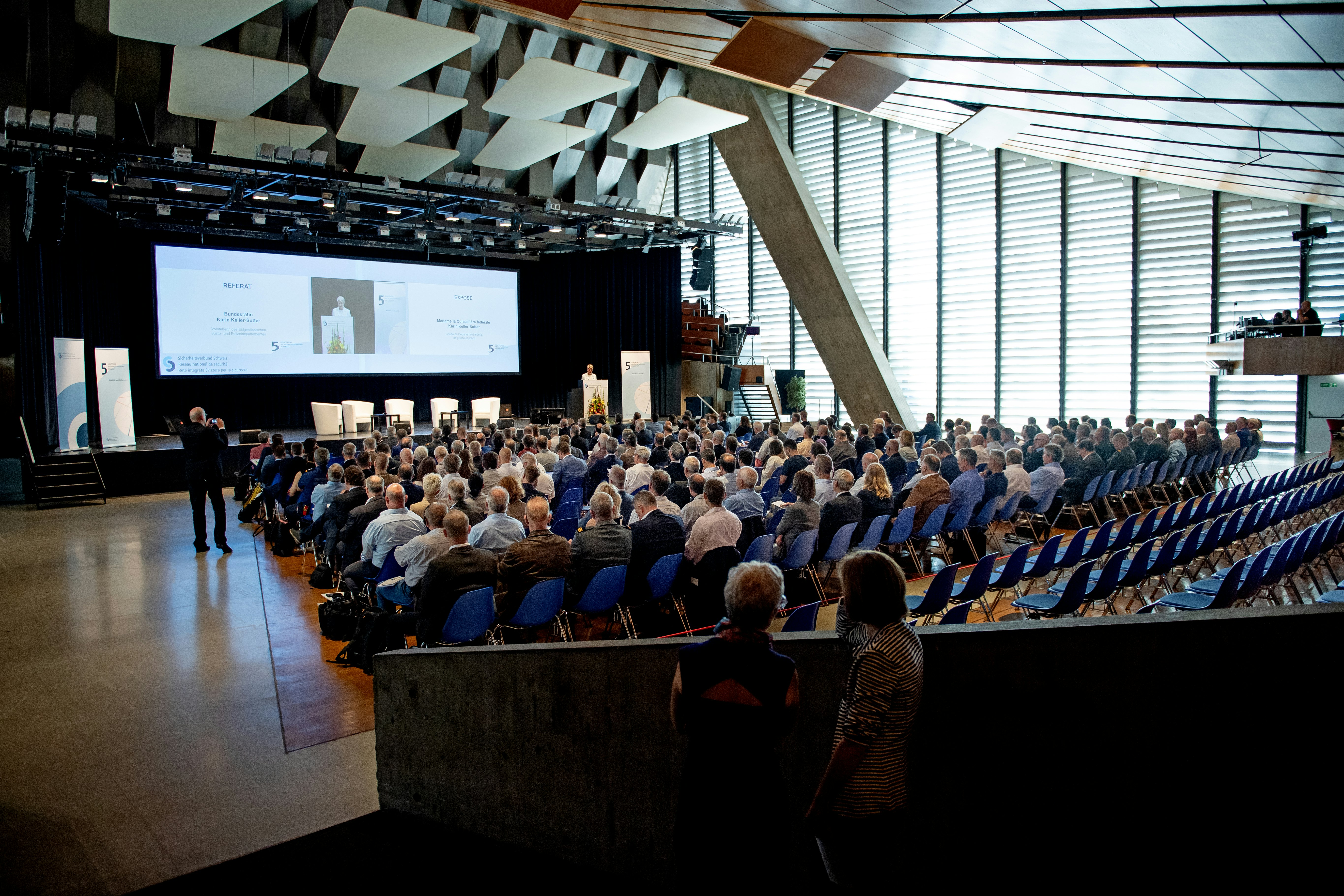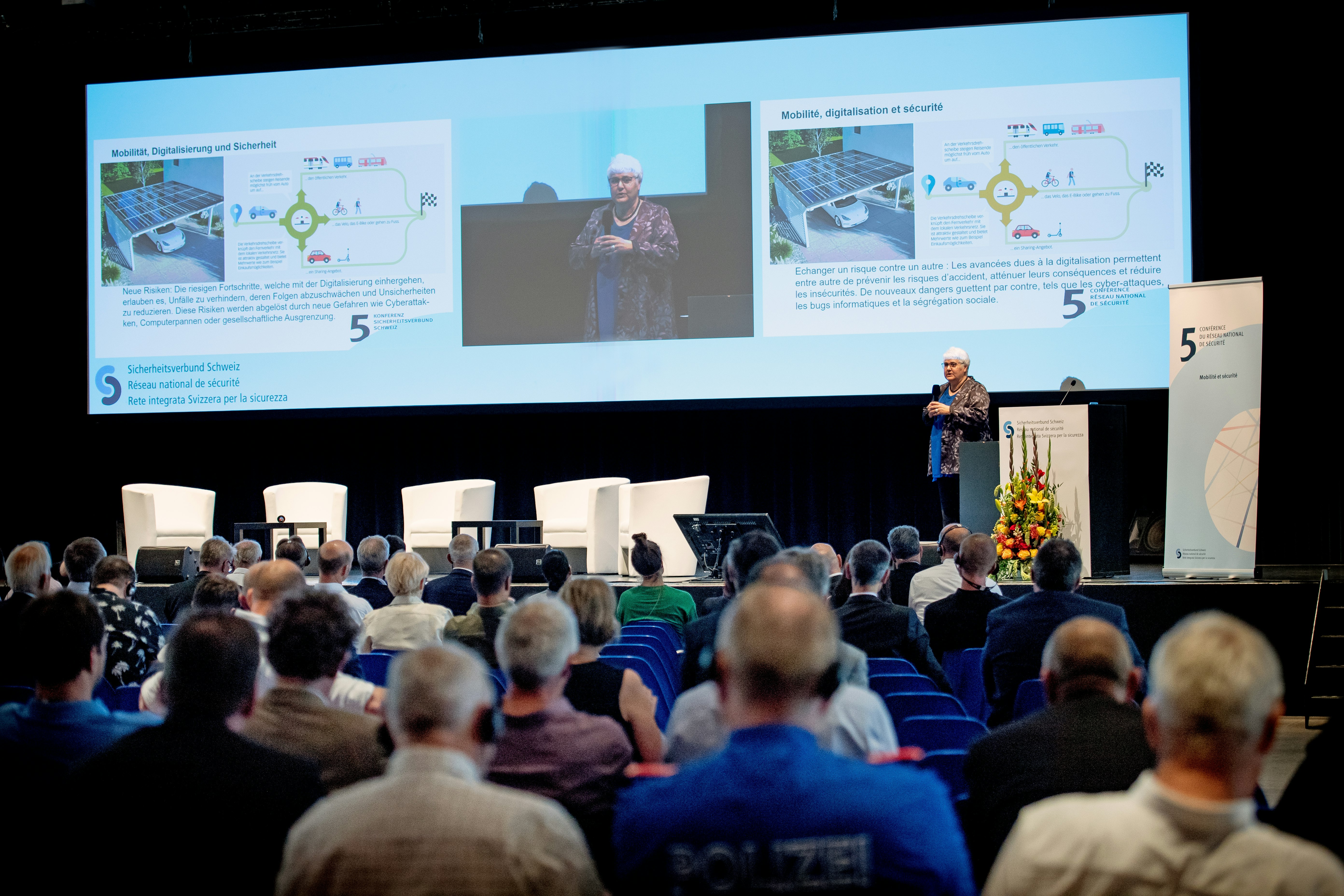Près de 300 participantes et participants issus de la Confédération, des cantons, des communes ainsi que des milieux économiques et politiques s’y sont réunis pour discuter des défis que pose la mobilité des personnes, des marchandises, des données et des services pour la sécurité de la population. La conseillère fédérale Karin Keller-Sutter a apporté des réflexions fondamentales du point de vue du Département fédéral de justice et police.